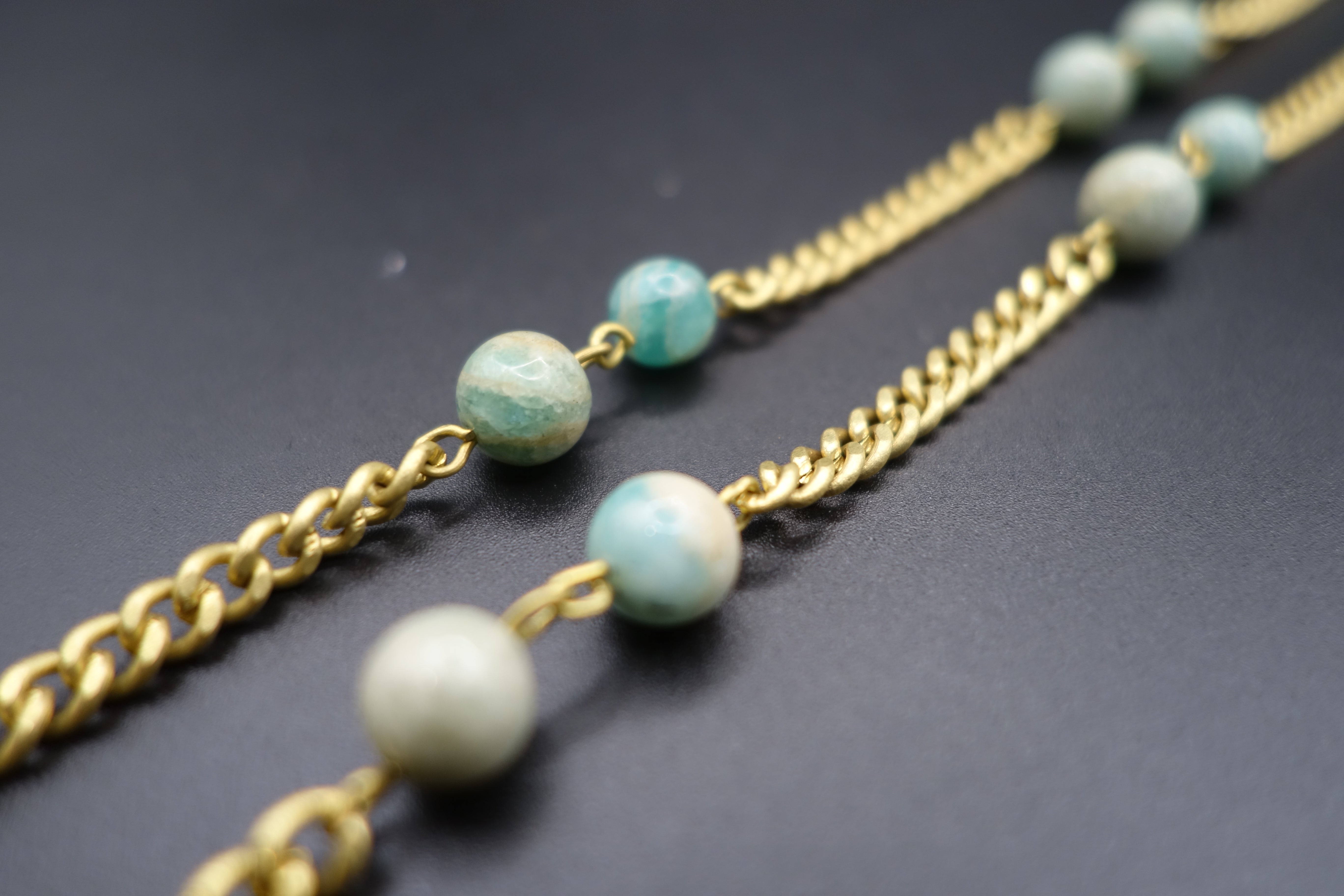 - Amazonite gemstones (15 to 20 pieces per chain) with two lobster clasps and rubber bands / elastics to connect to the glasses.