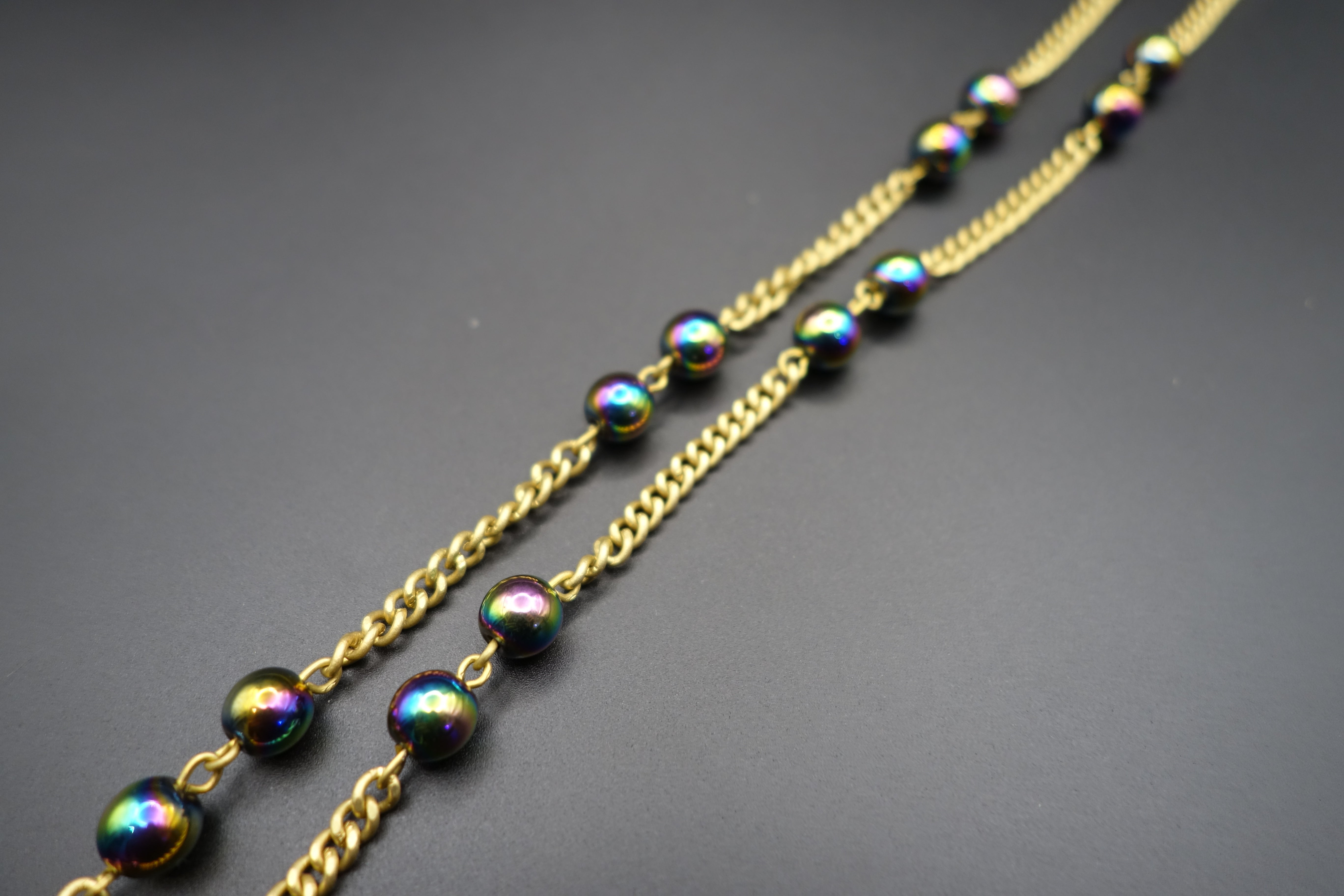 Elevate your sunglasses/eyeglasses look with a unique brass chain embellished with metallic Rainbow beads.