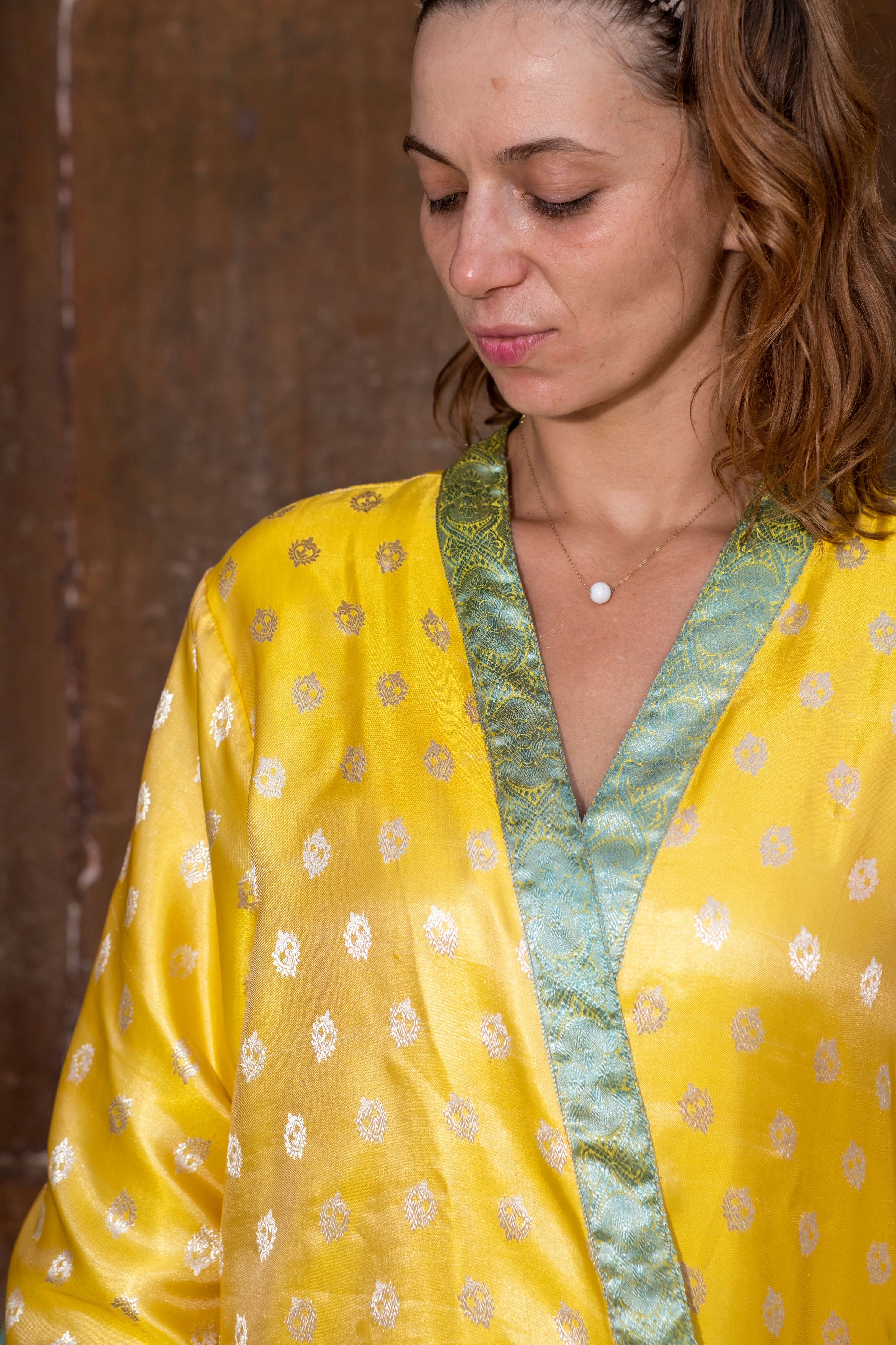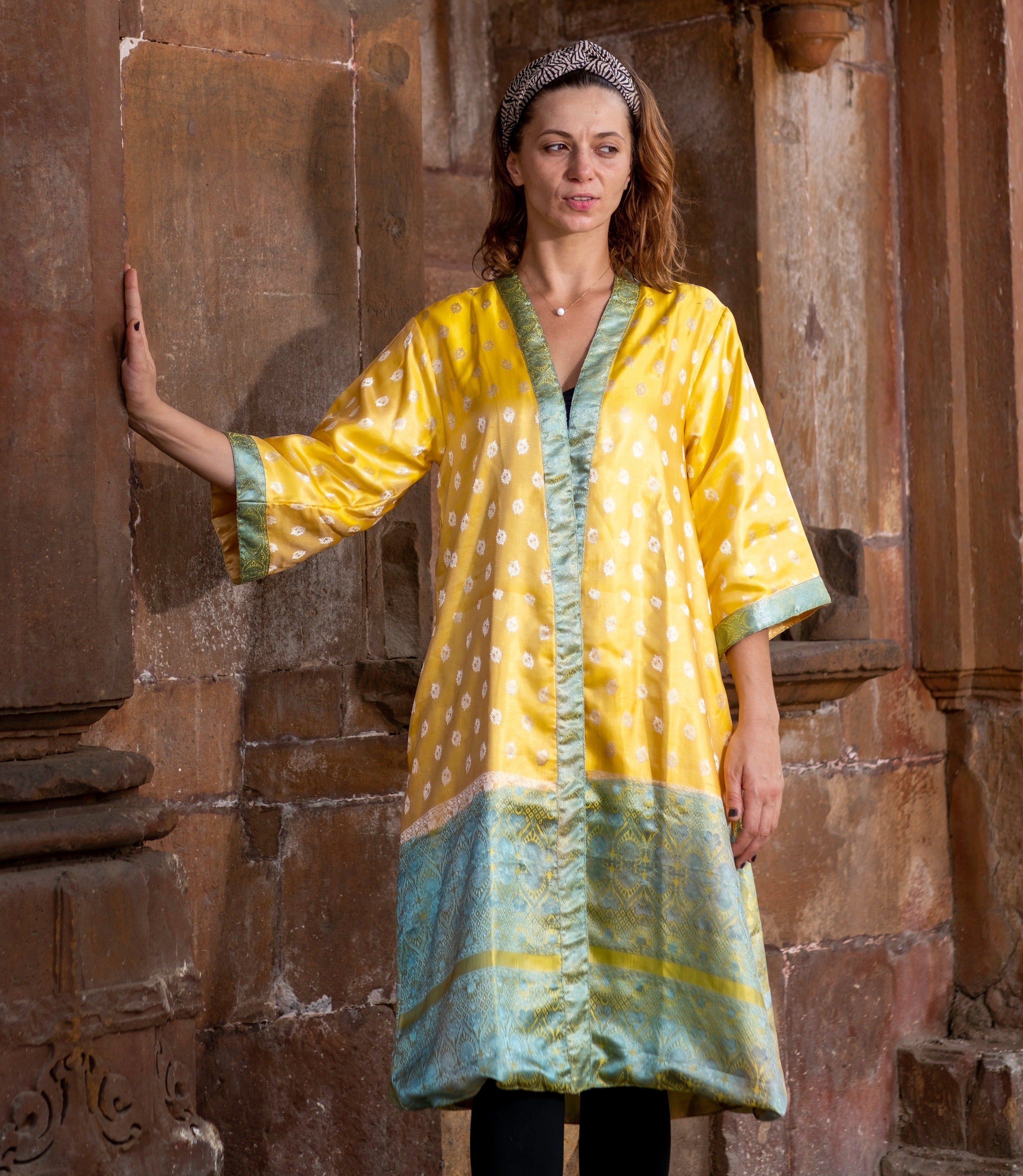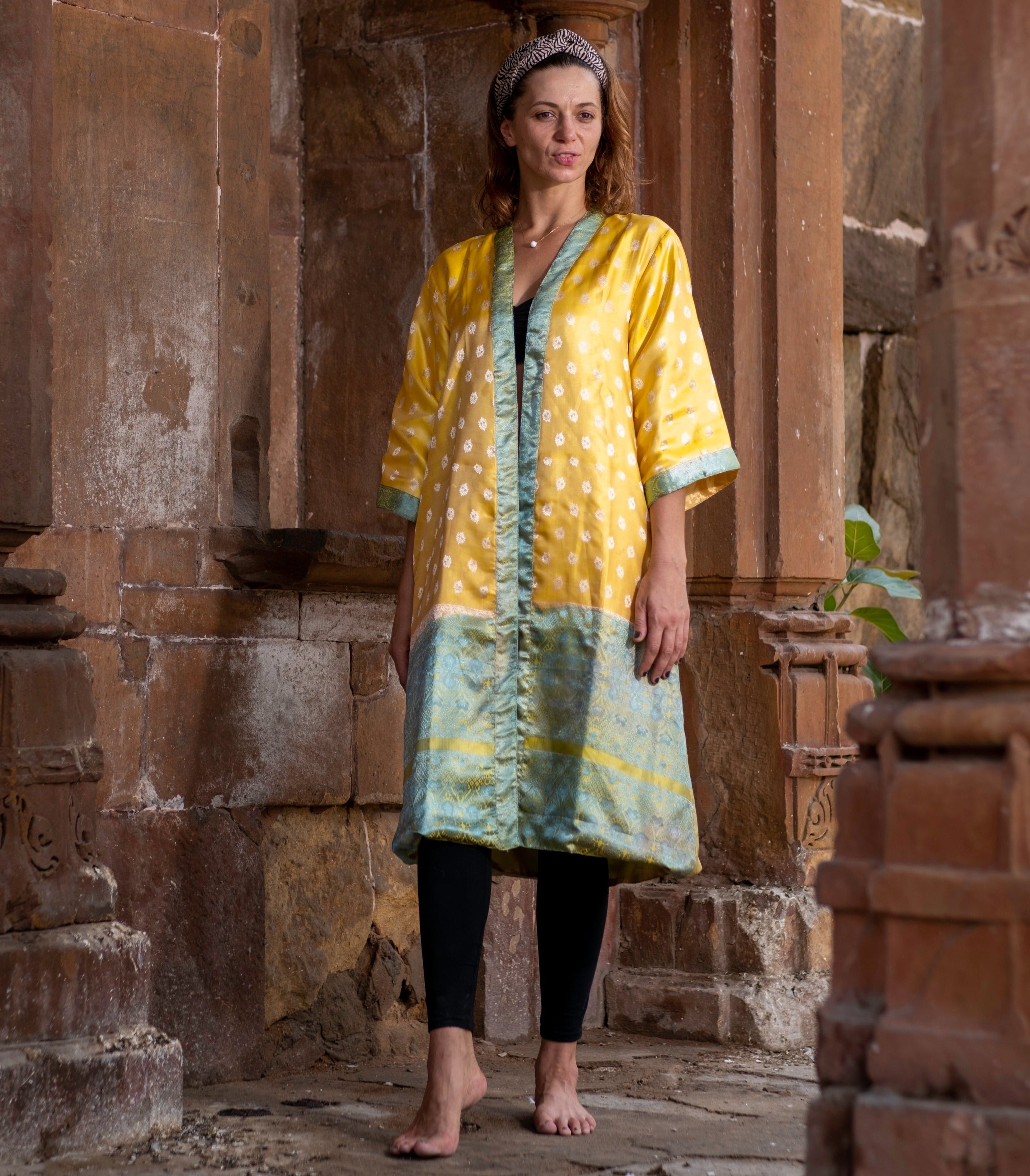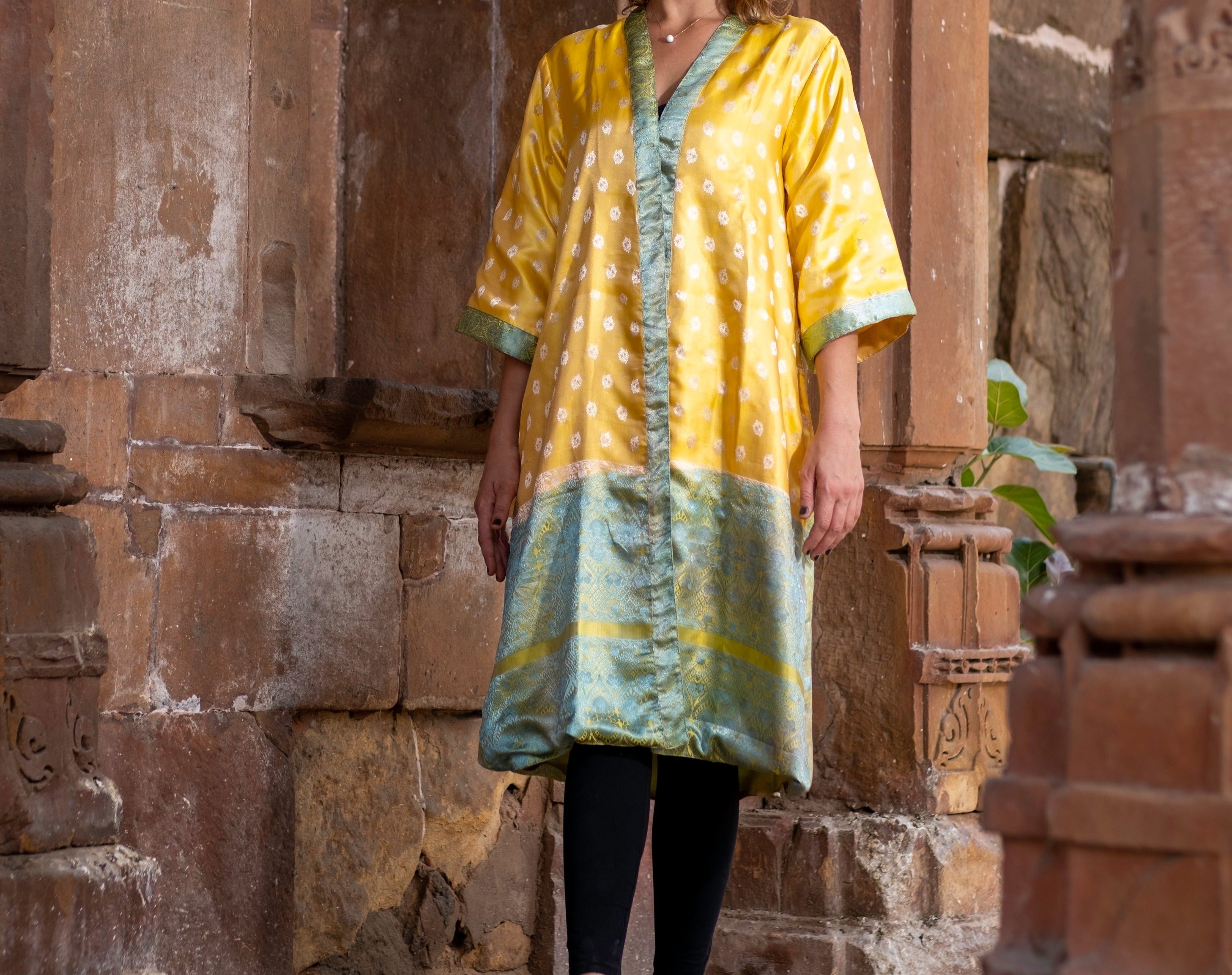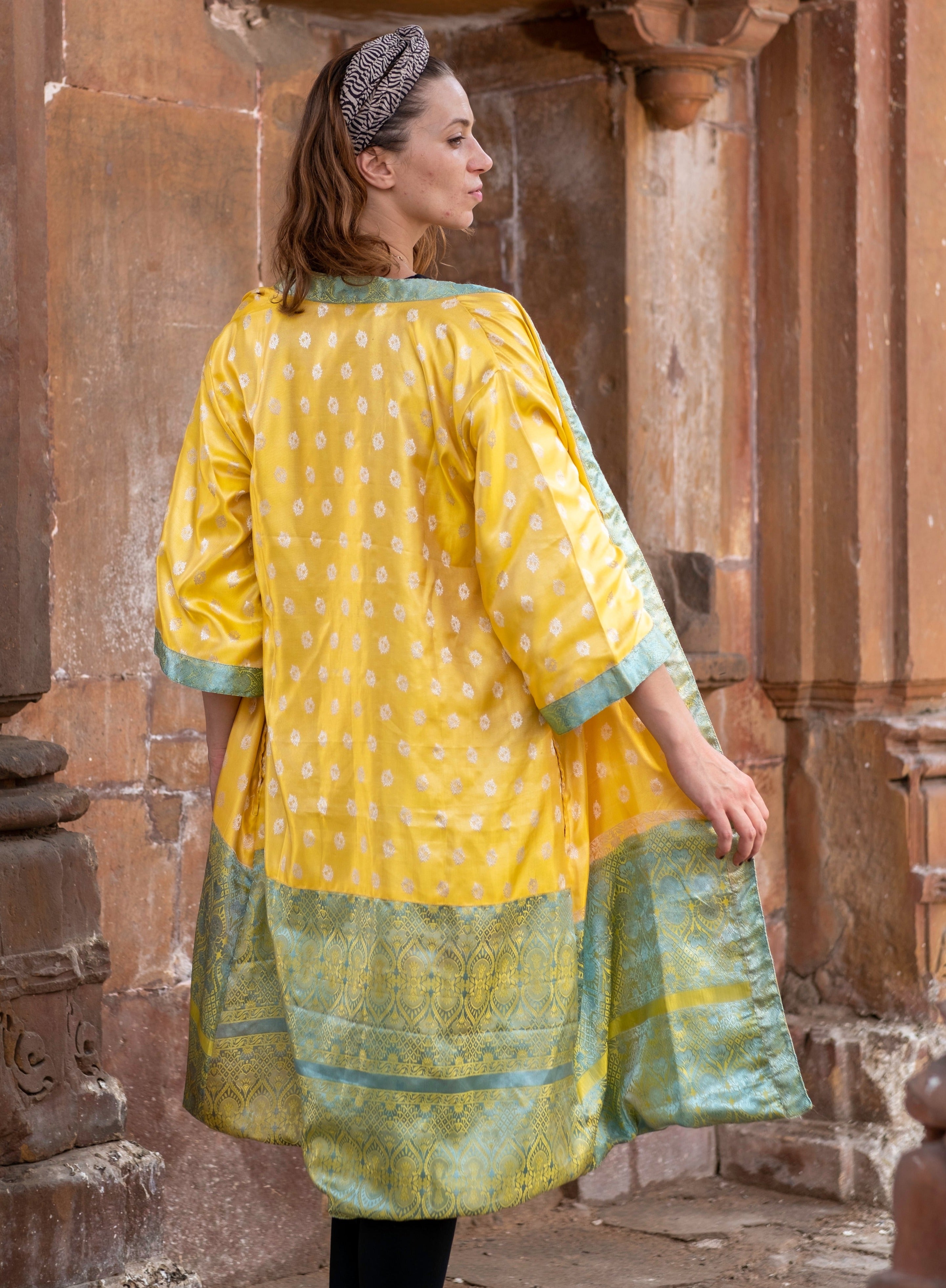 Experience a truly unique look with Sun, a vibrant yellow kimono made from a recycled silk saree. Its eye-catching vintage design will leave you turning heads wherever you go!