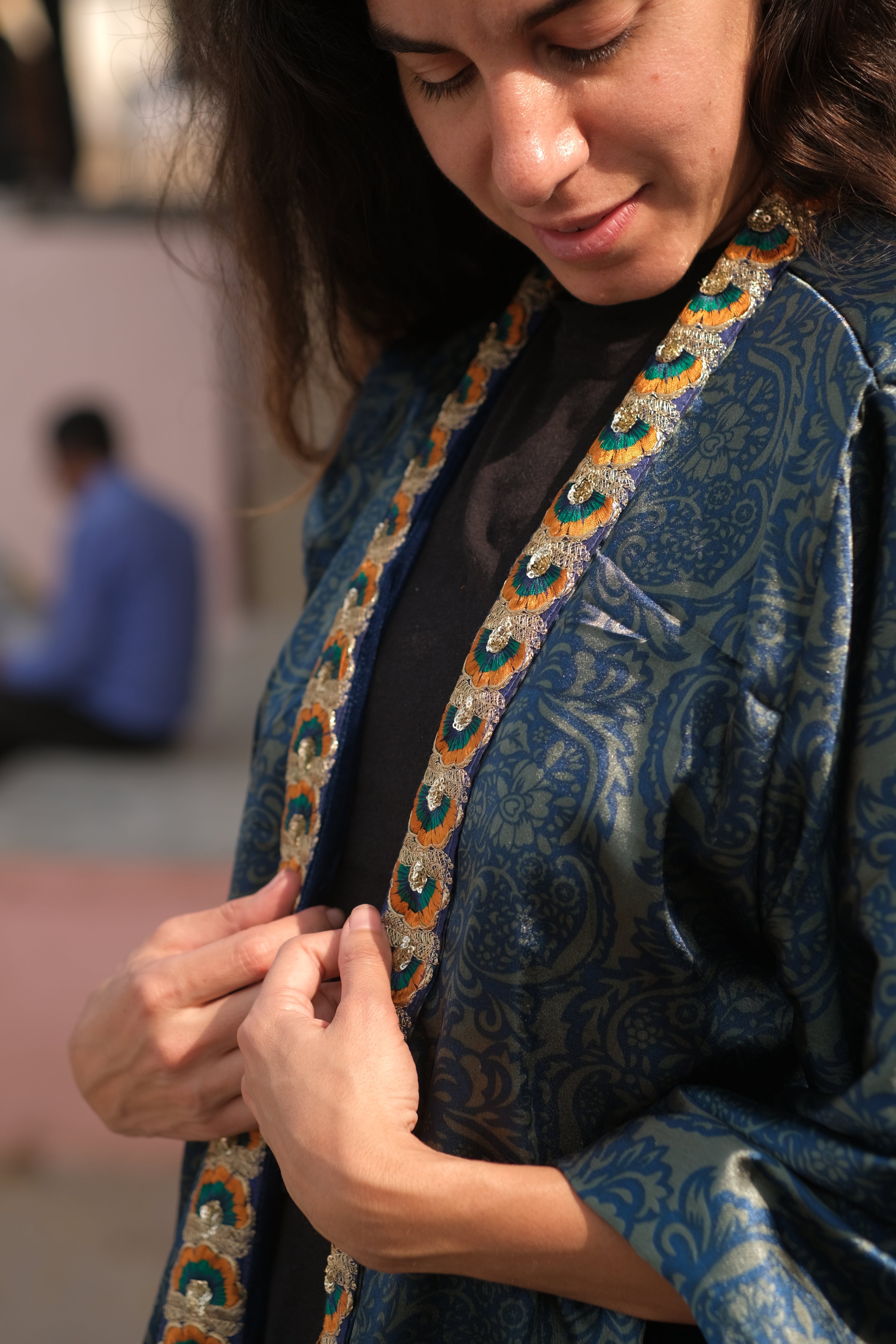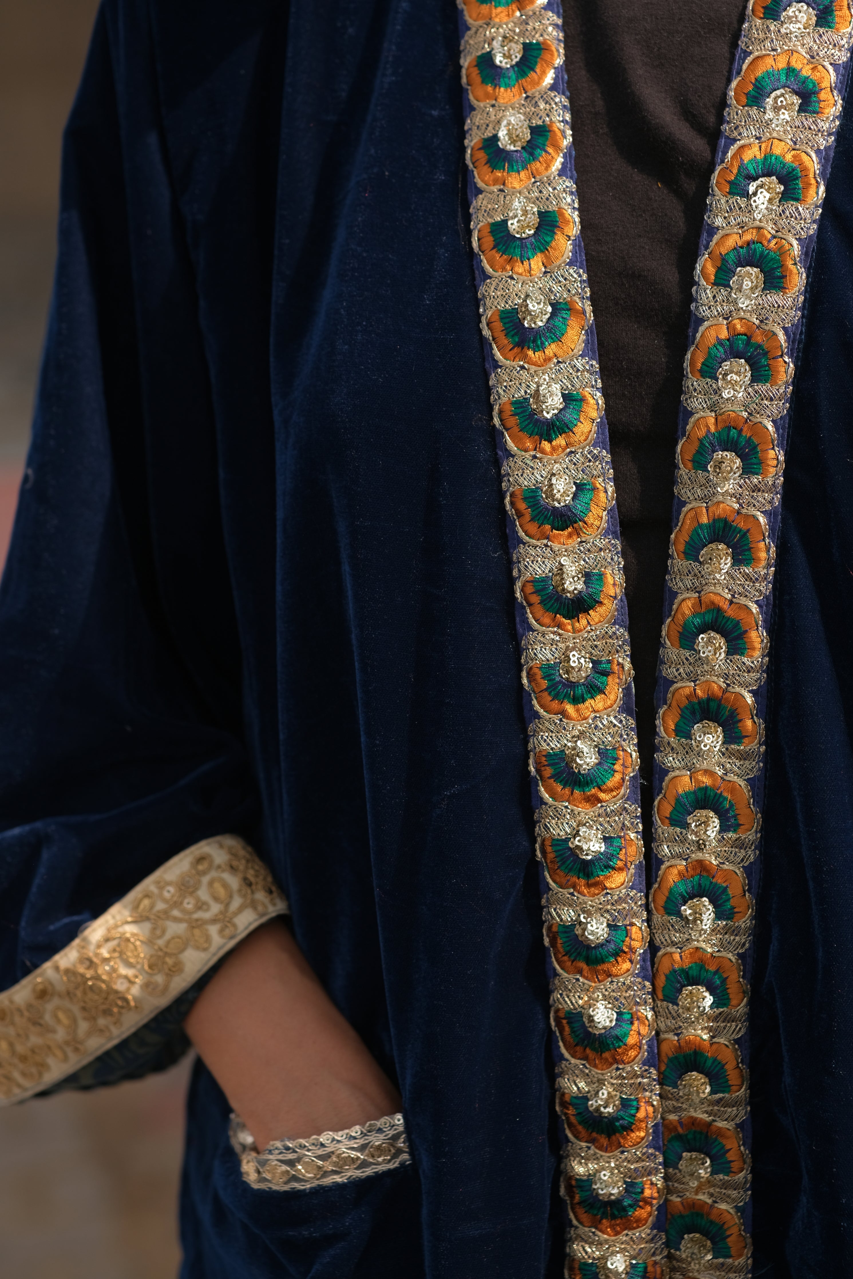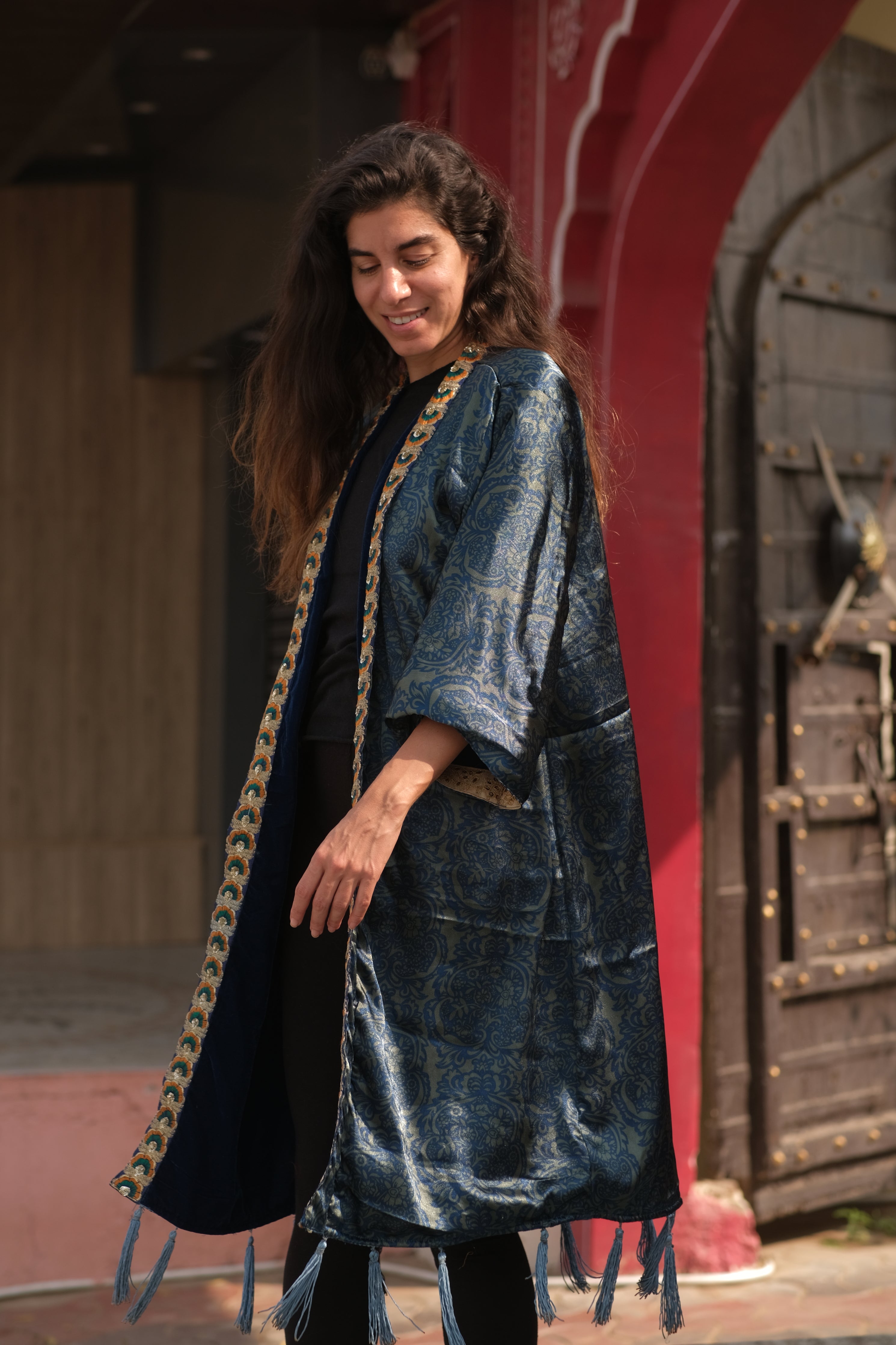 Peacock - a royal teal kimono with a peacock border. Our Velvet Kimonos boast a fusion of textures and aesthetics, combining the plushness of velvet with the smoothness of satin. This Kimono will envelop you in a cocoon of luxury, while adding a touch of refinement and indulgence to your look.