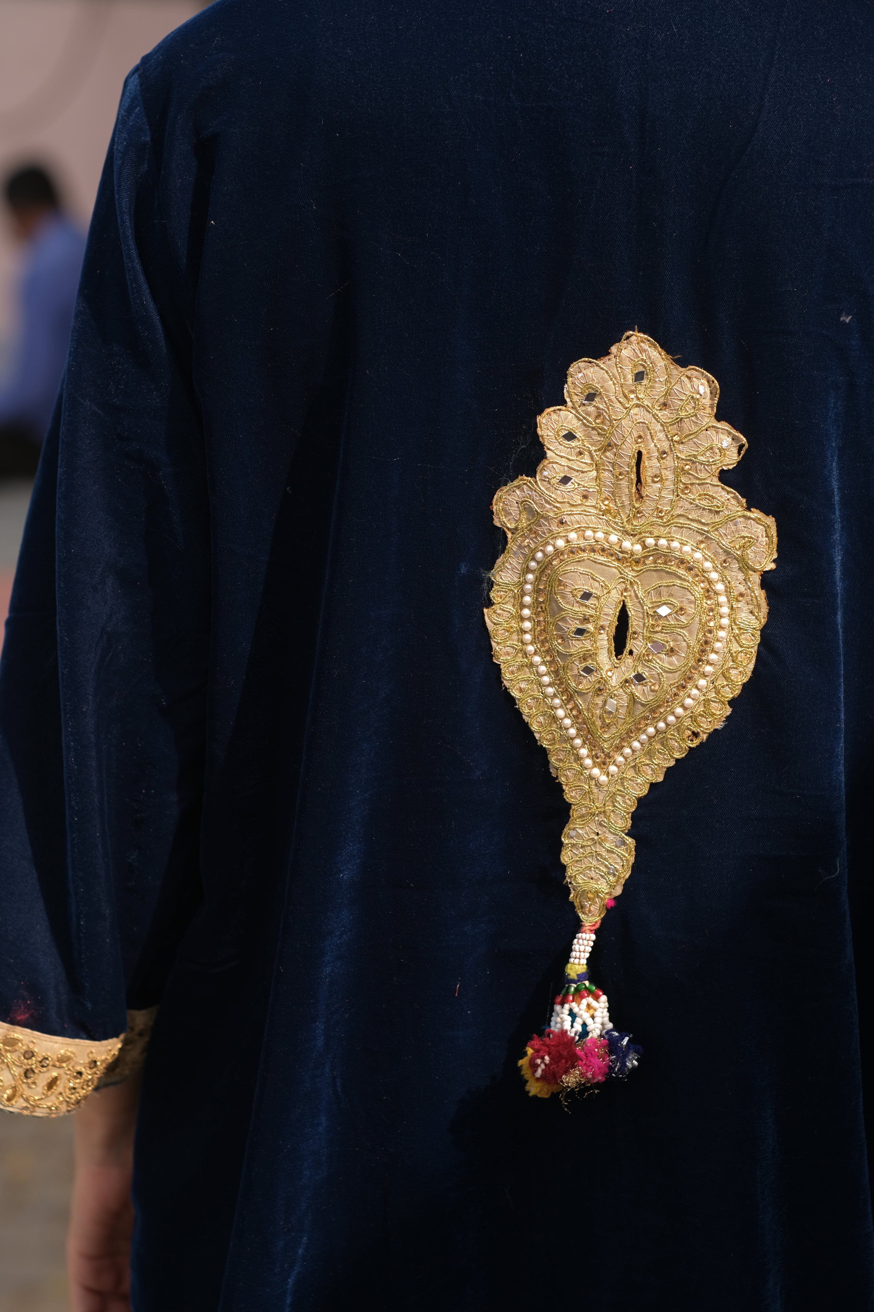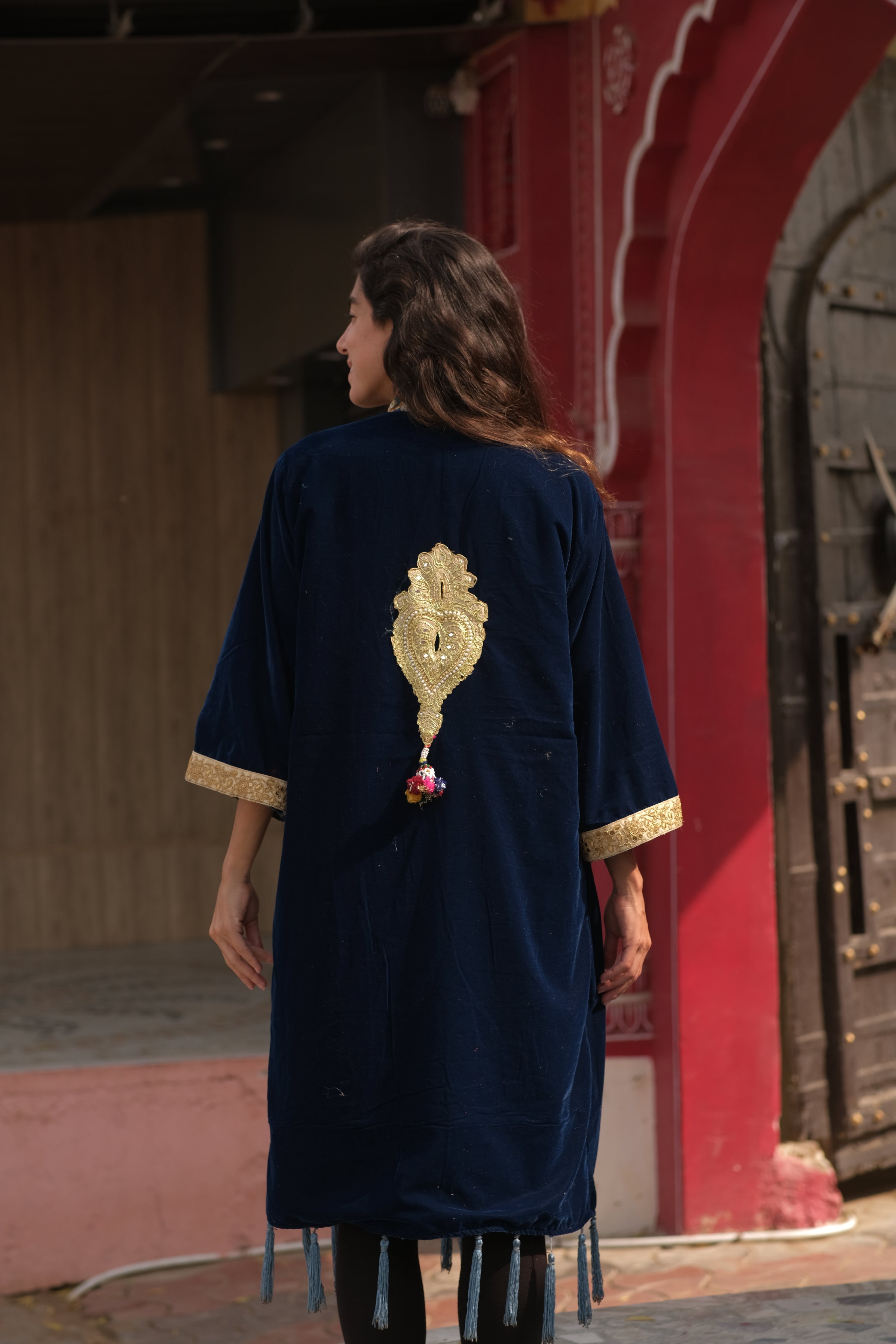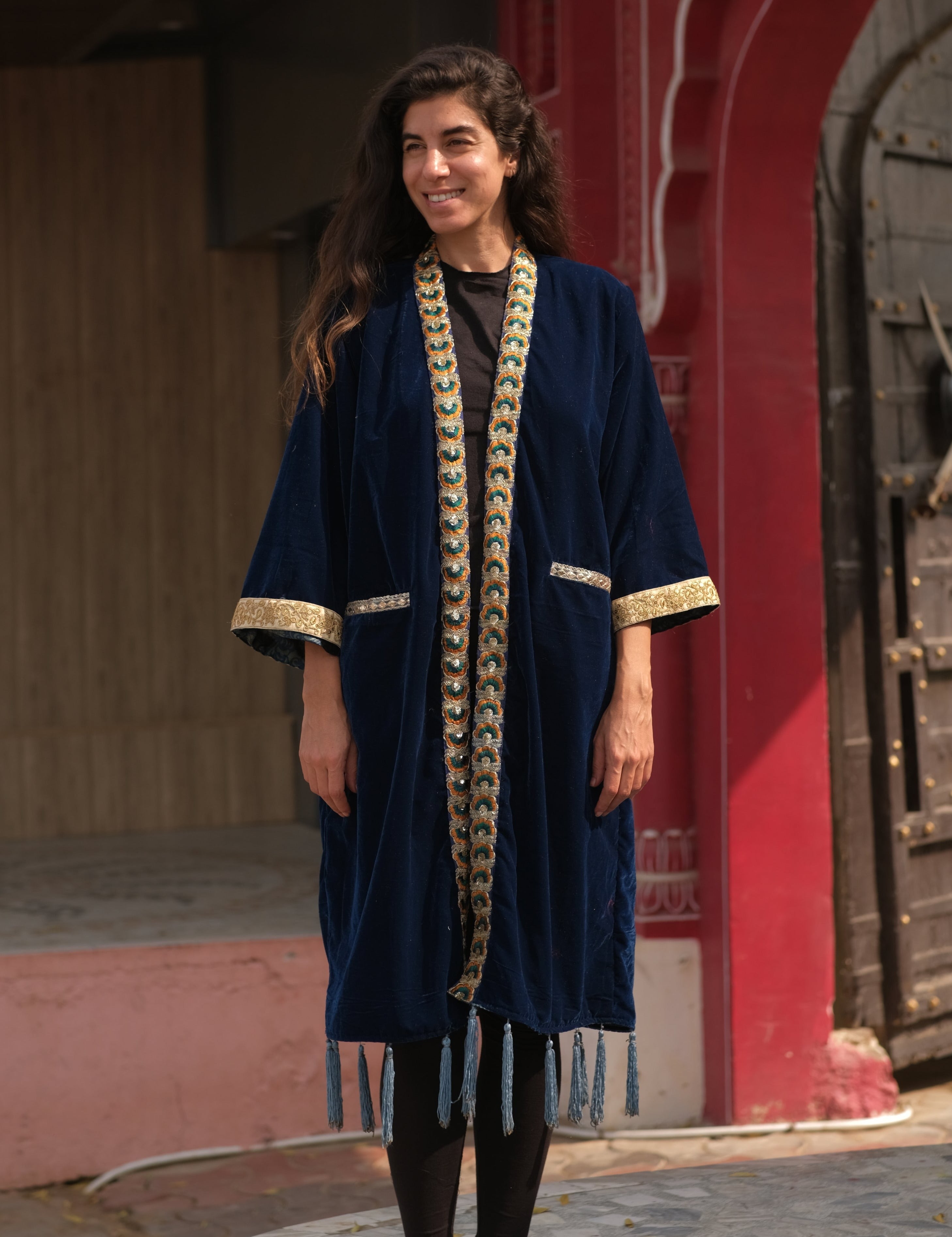 Peacock - a royal teal kimono with a peacock border. Our Velvet Kimonos boast a fusion of textures and aesthetics, combining the plushness of velvet with the smoothness of satin. This Kimono will envelop you in a cocoon of luxury, while adding a touch of refinement and indulgence to your look.