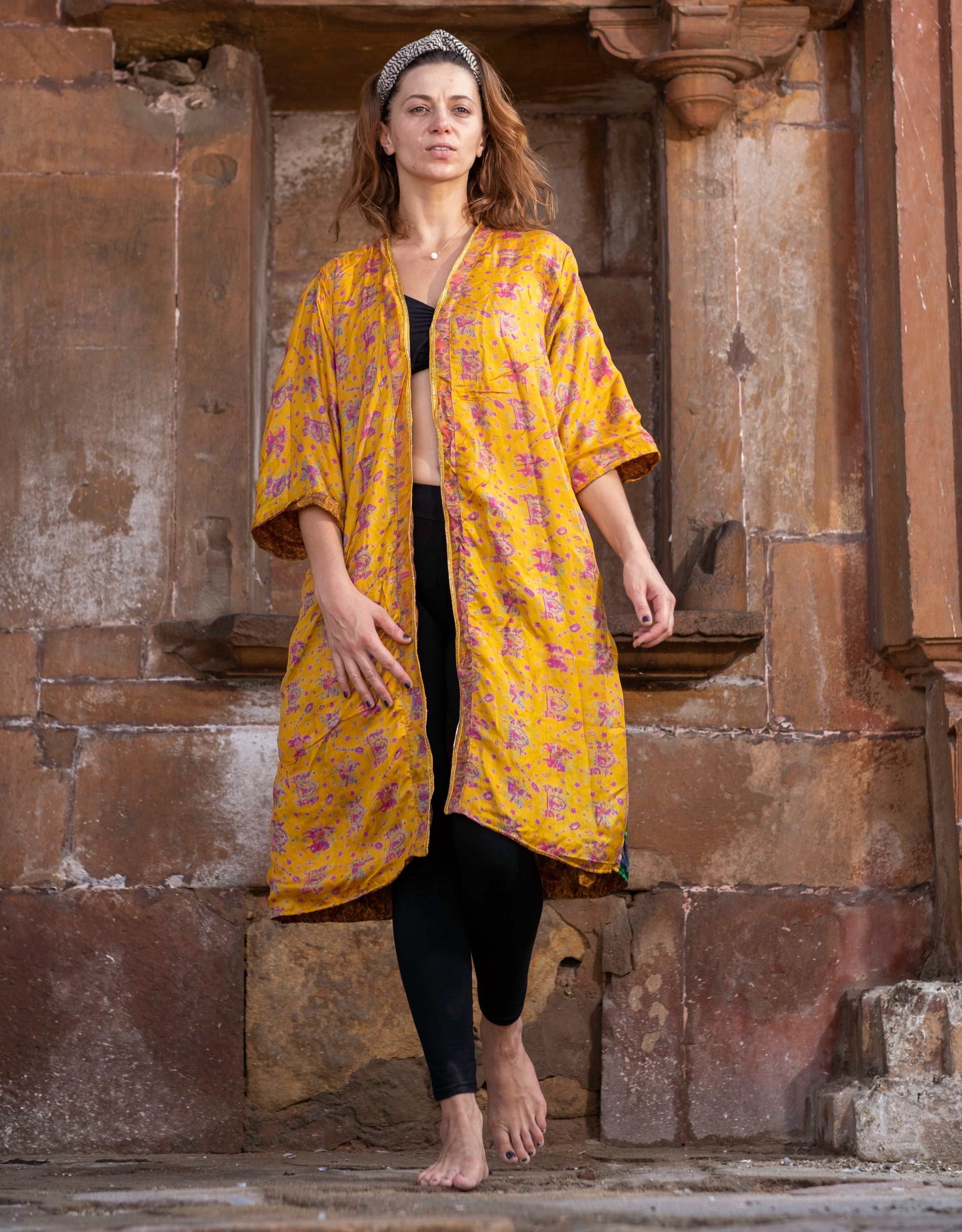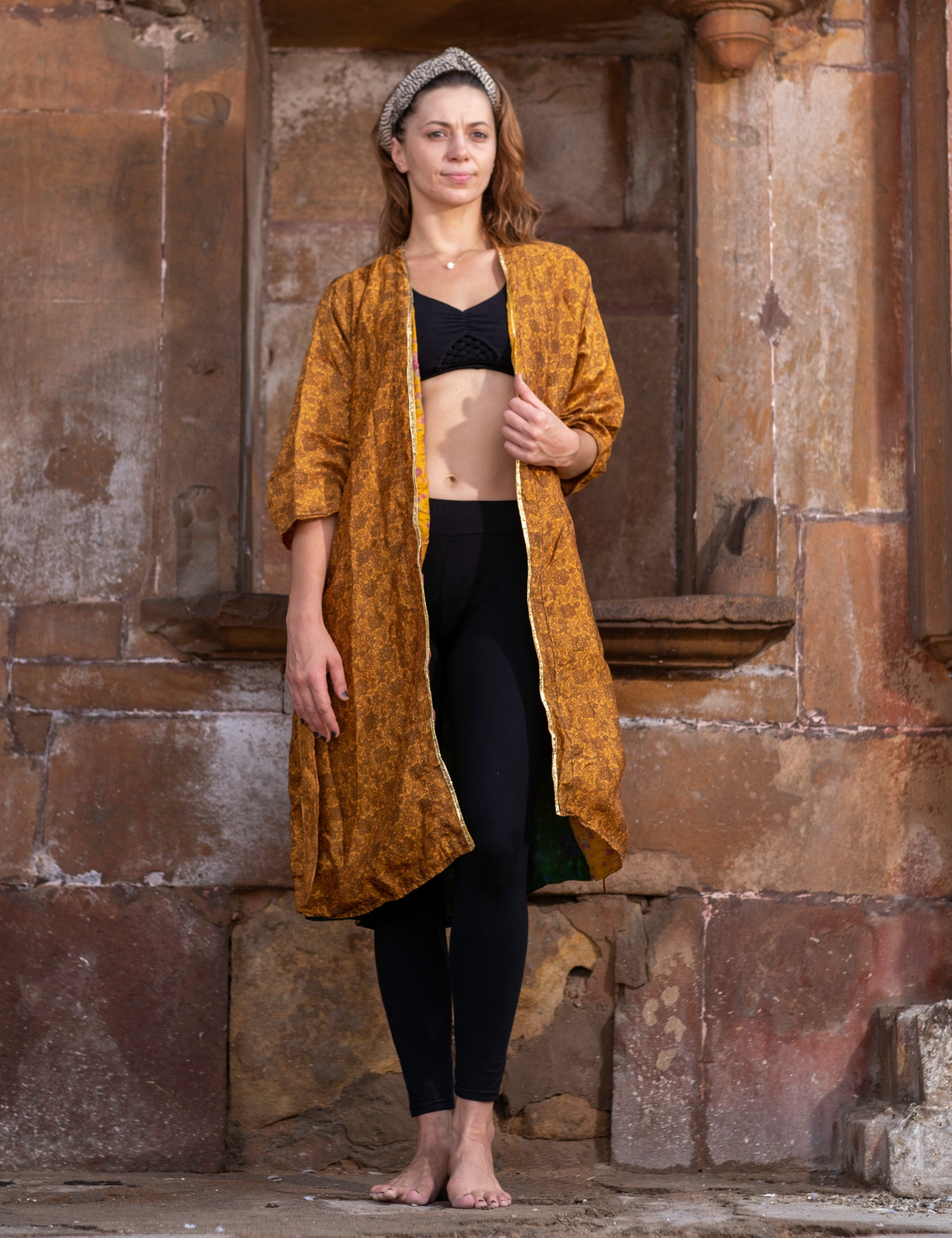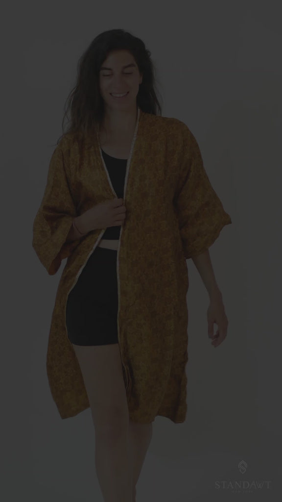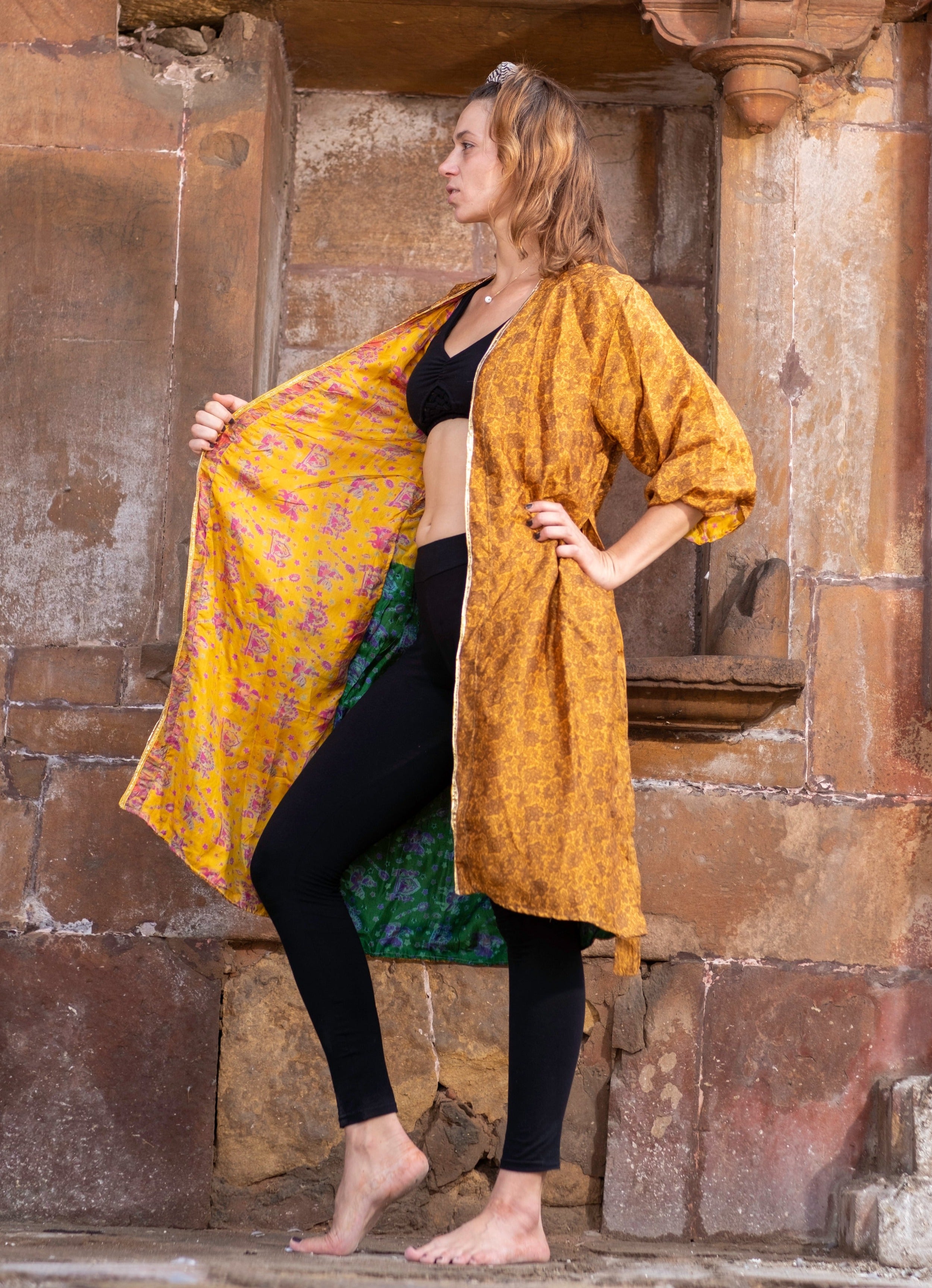 Be the stunning star of your own show in Golden Glow. This stunning collection includes a reversible gold kimono, made from recycled sarees and featuring a beautiful gold border. Shine bright in Golden Glow!