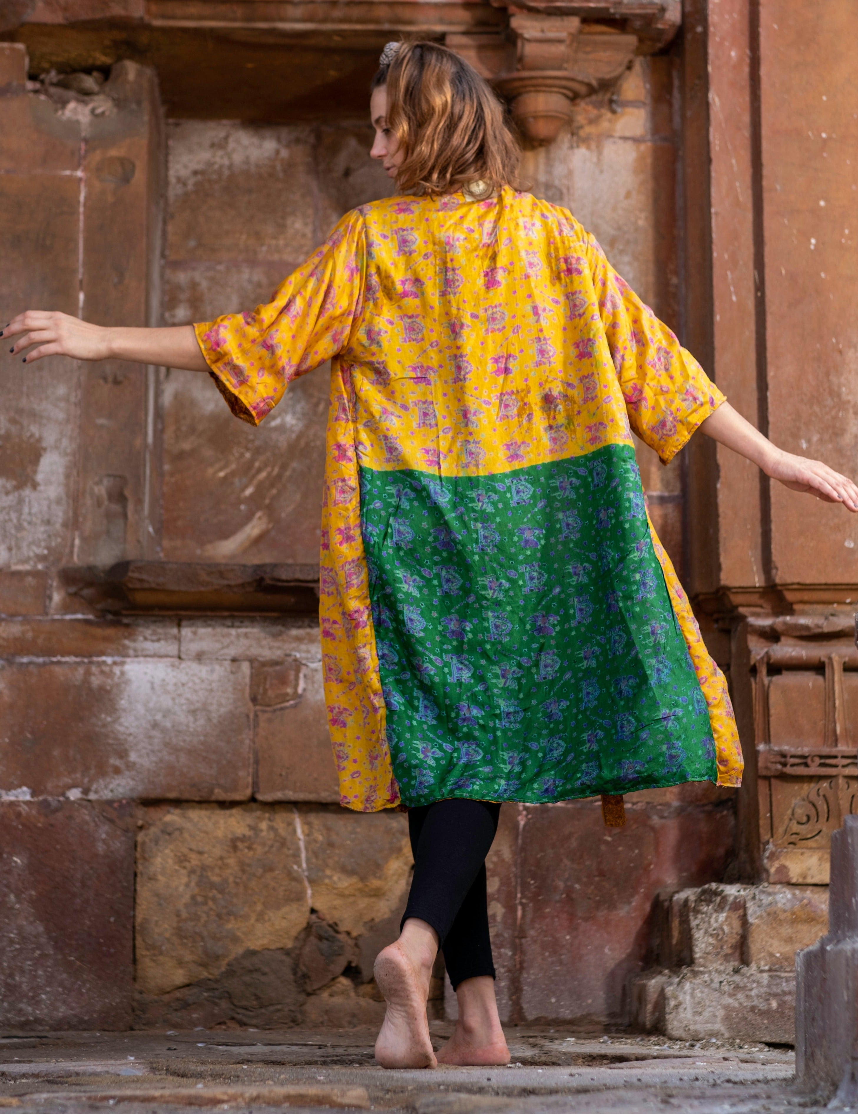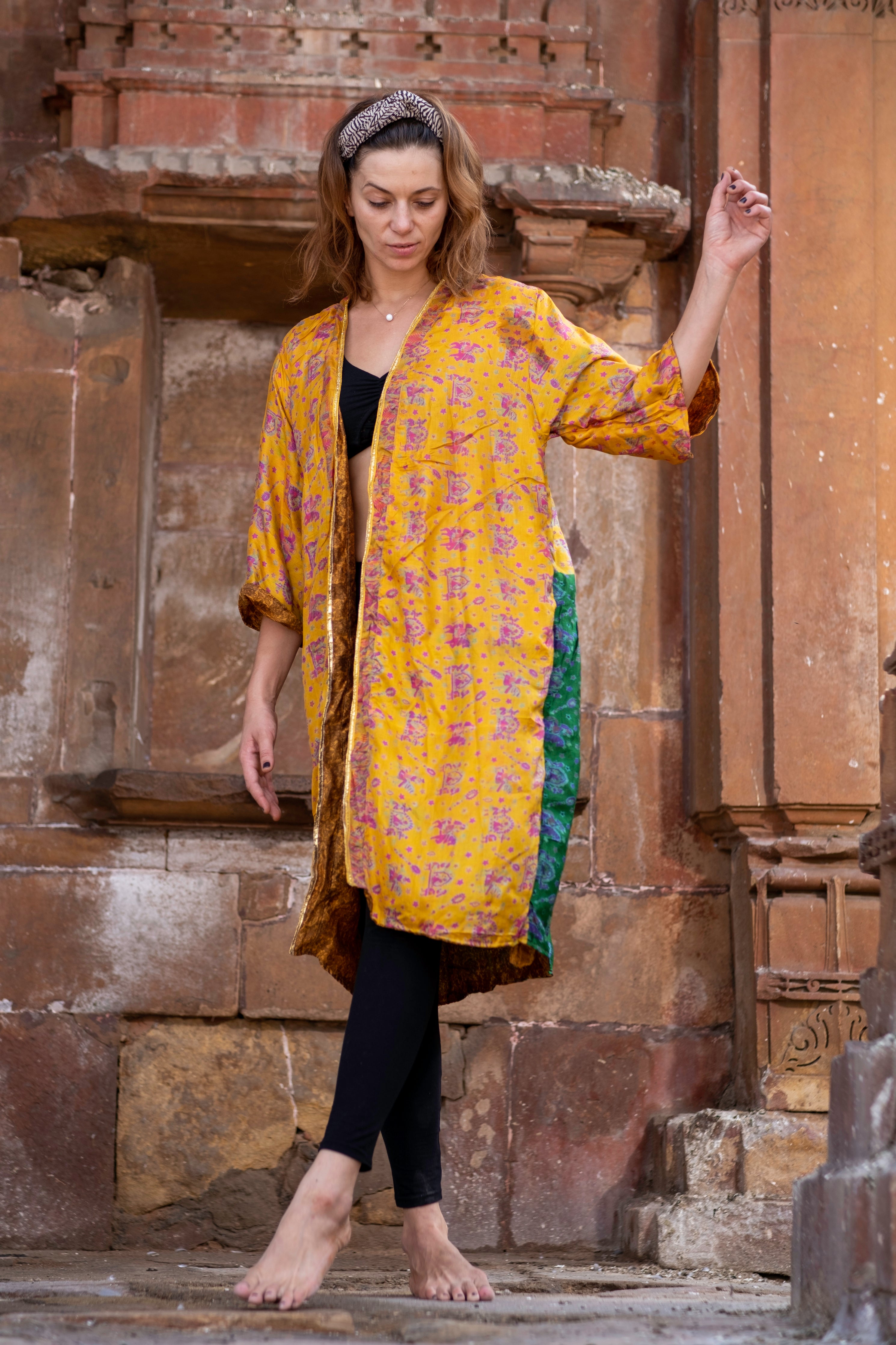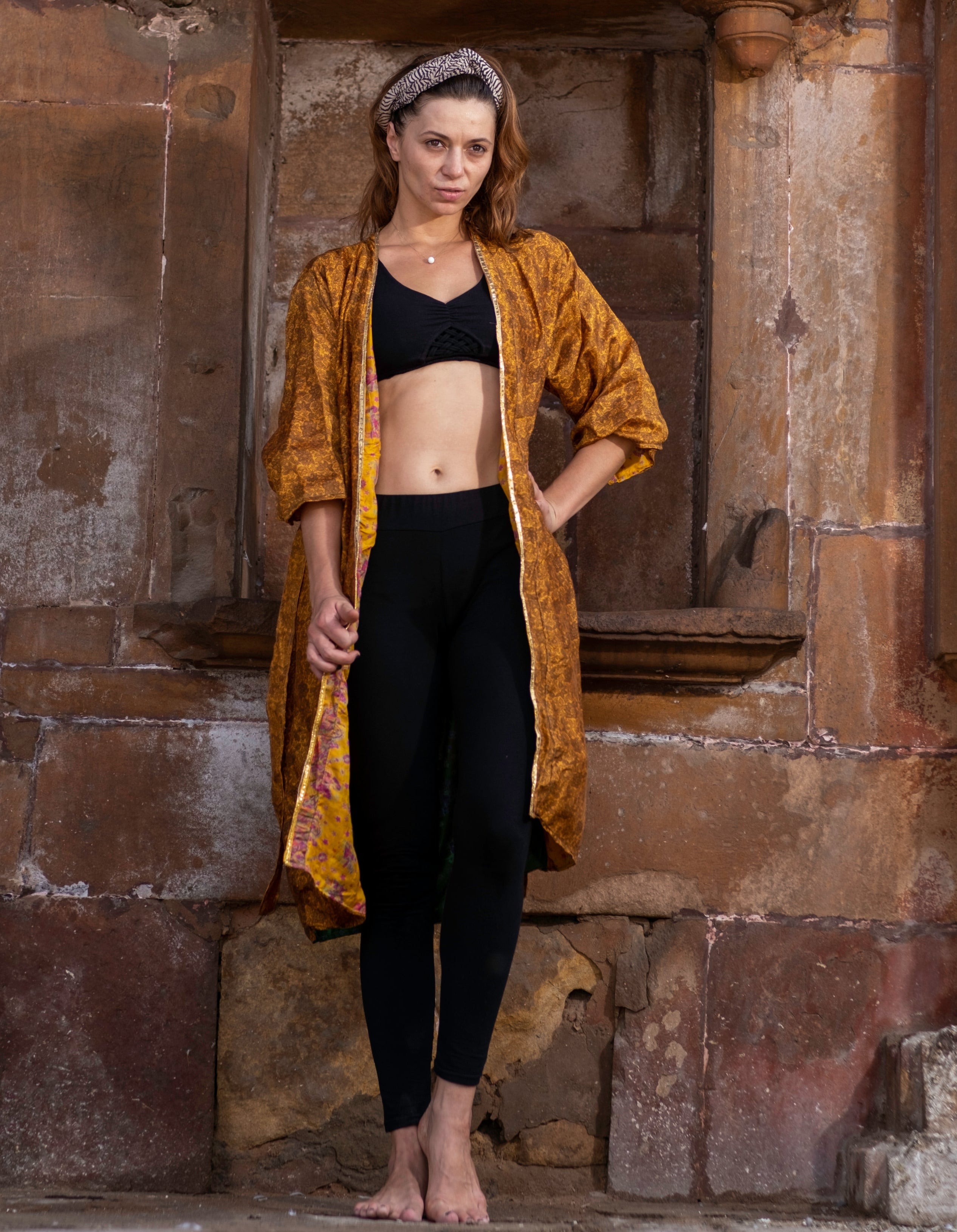Be the stunning star of your own show in Golden Glow. This stunning collection includes a reversible gold kimono, made from recycled sarees and featuring a beautiful gold border. Shine bright in Golden Glow!