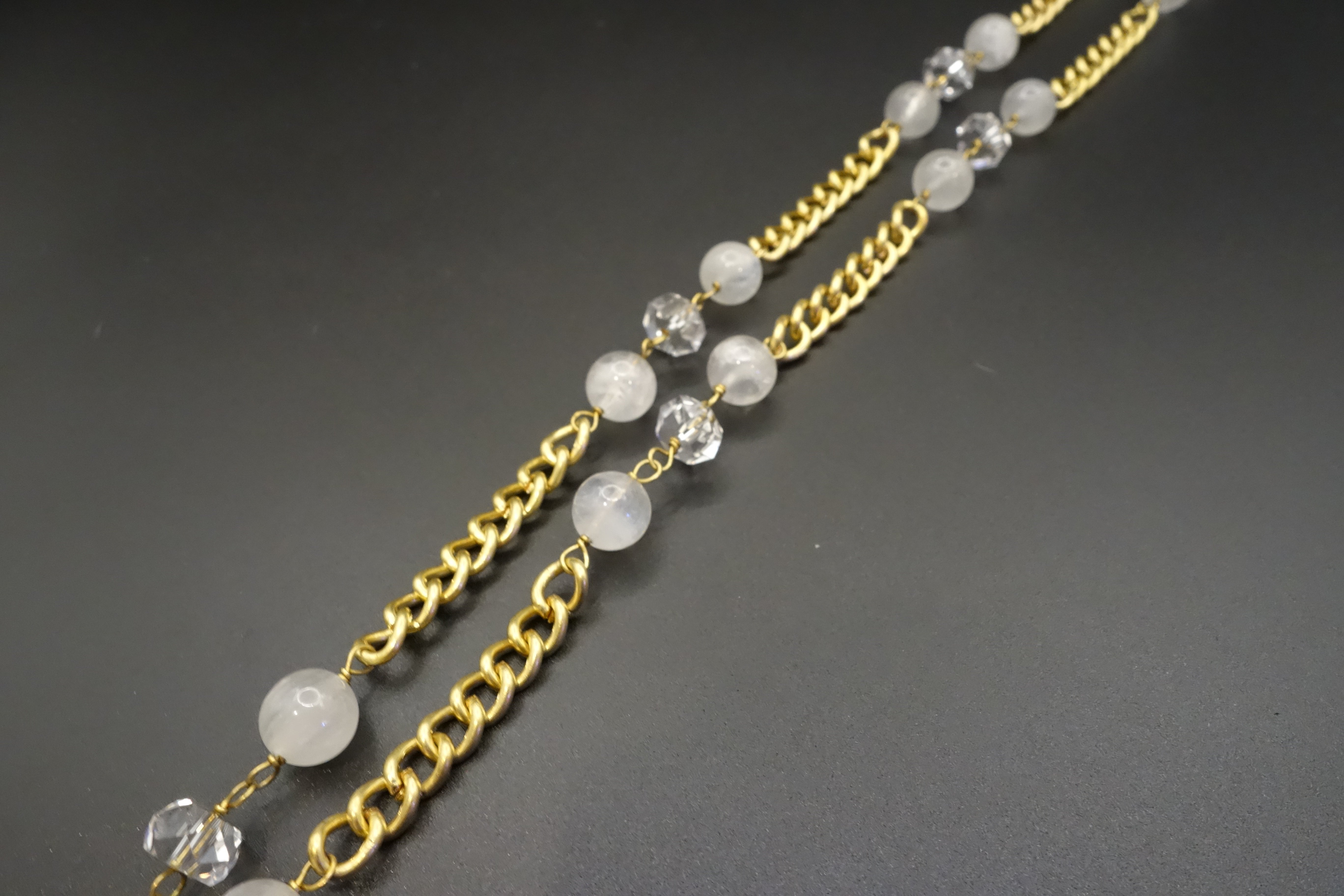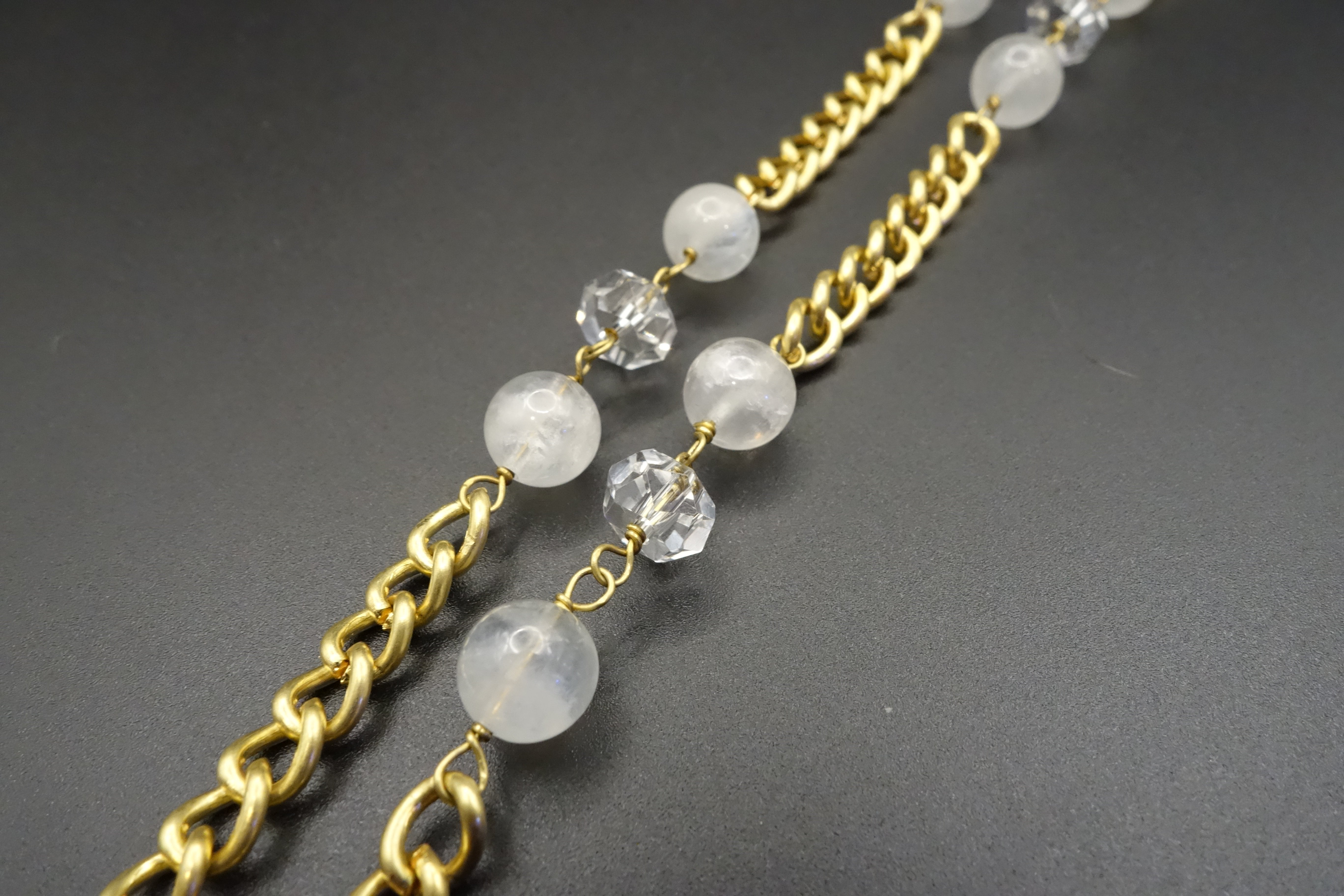 - A combination of Moonstone and Clear Quartz gemstones (15 to 20 pieces) with two lobster clasps and rubber bands / elastics to connect to the glasses.
