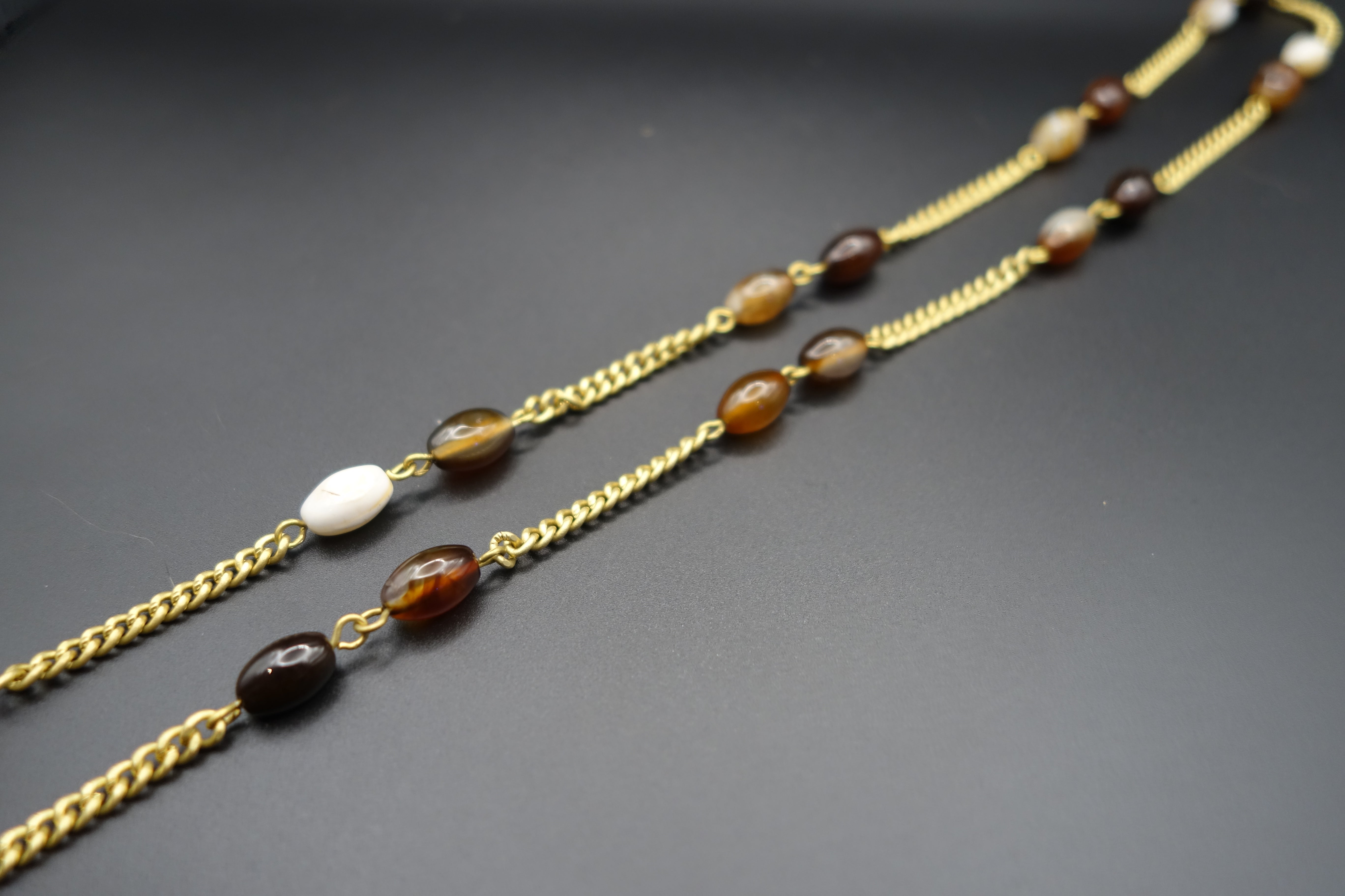 - A variety of beads and gemstones (15 to 20 pieces per chain) with two lobster clasps and rubber bands / elastics to connect to the glasses.