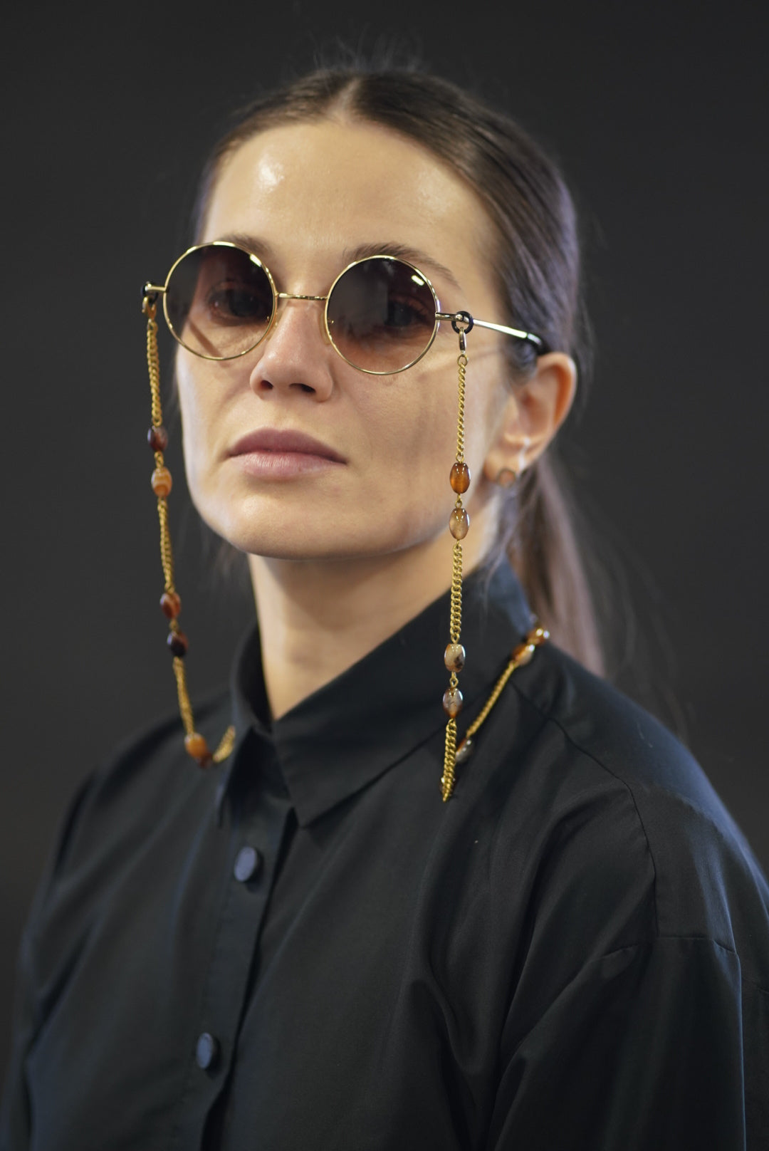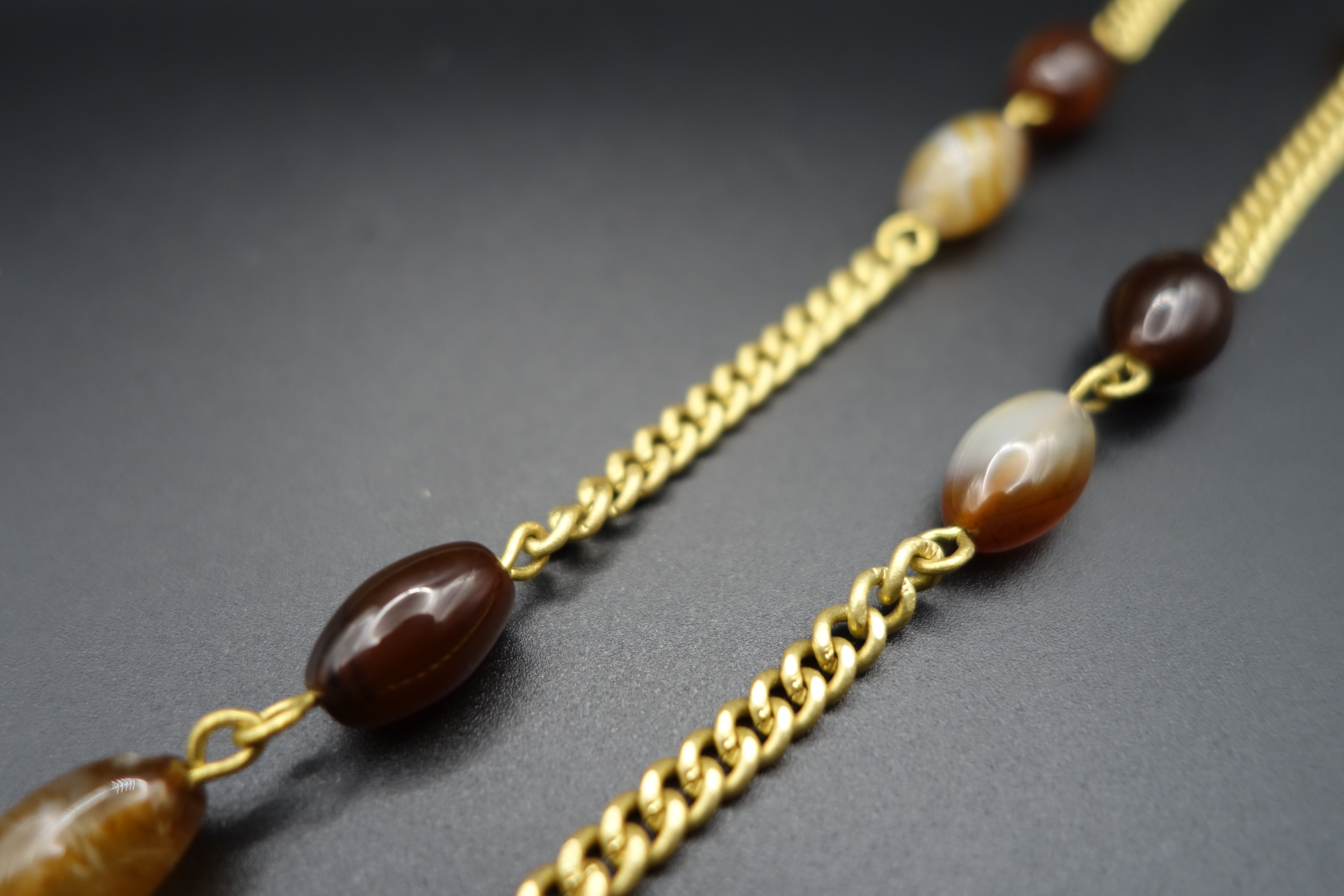 Elevate your sunglasses/eyeglasses look with a unique brass chain embellished with Carnelian, a vibrant gemstone known for its rich orange-brown hues and associations with courage and creativity.